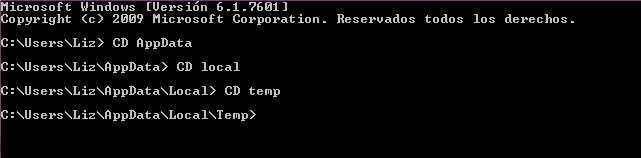 Abre la consola y teclea carpeta por carpeta la ruta hasta el directorio, colocando CD «nombre de carpeta» y apretando ENTER tal como se muestra en la imagen