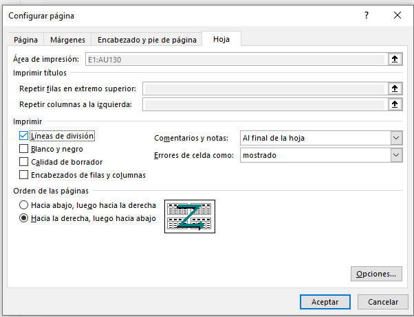 Así mismo, selecciona la sección de Hoja y desactiva la opción «Lineas de División» en caso de que esté activa la opción.